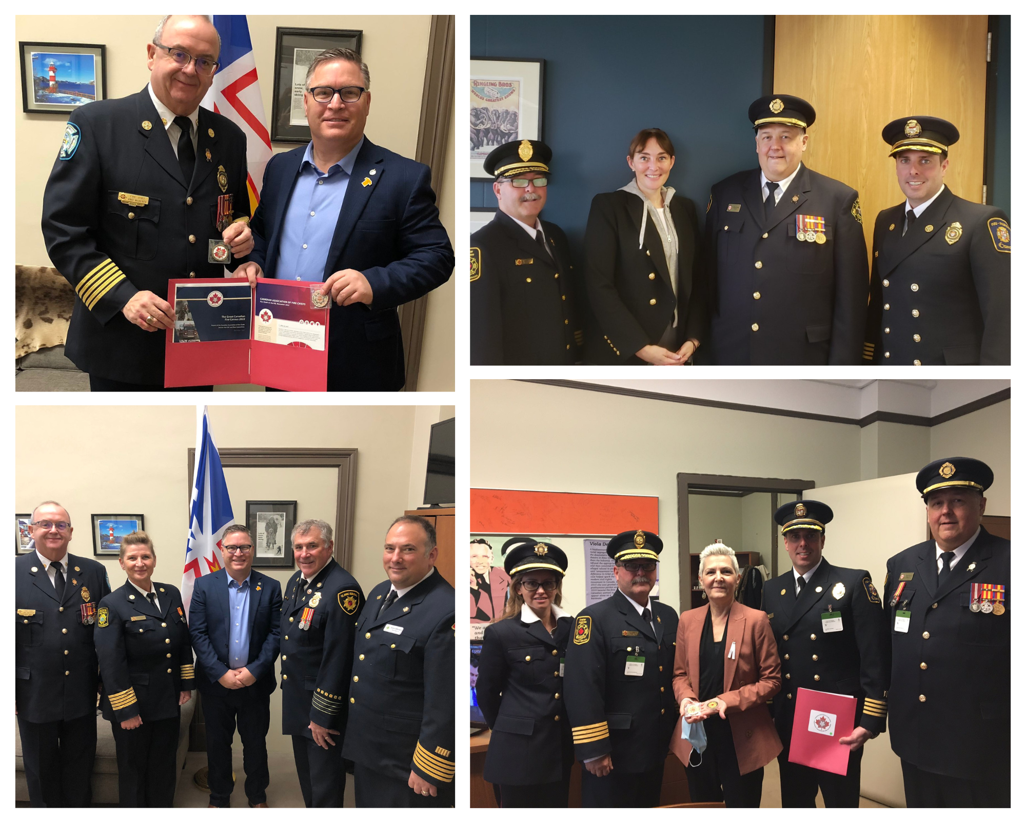 CAFC President Red Deer Fire Chief Ken McMullen, Lac St Anne County Fire Chief Randy Schroder and Regina Beach Fire Chief Shayne LaMontagne meet with Member of Parliament Sherry Romanado